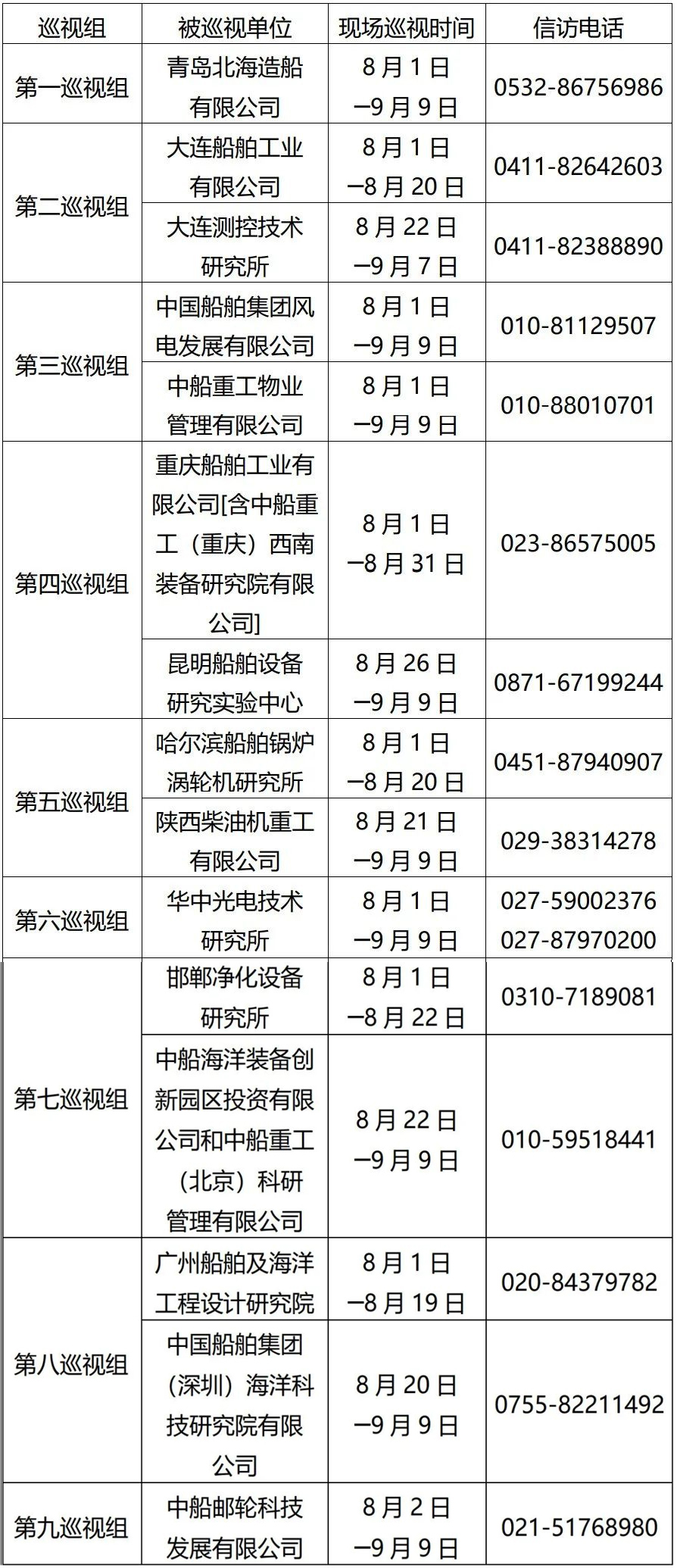 根據中國船舶集團黨組2022年第一輪巡視工作部署,截至2022年8月2日,中國船舶集團黨組9個巡視組已進駐青島北海造船有限公司、大連船舶工業有限公司、中國船舶集團風電發展有限公司、中船重工物業管理有限公司、重慶船舶工業有限公司[含中船重工(重慶)西南裝備研究院有限公司]、哈爾濱船舶鍋爐渦輪機研究所、華中光電技術研究所、邯鄲凈化設備研究所、廣州船舶及海洋工程設計研究院、中船郵輪科技發展有限公司等單位,對其黨組織開展為期40天左右的現場巡視。巡視期間,巡視組設置專門值班電話(具體如下表)。同時在巡視組工作現場設置聯系信箱,廣大干部職工可以反映情況。