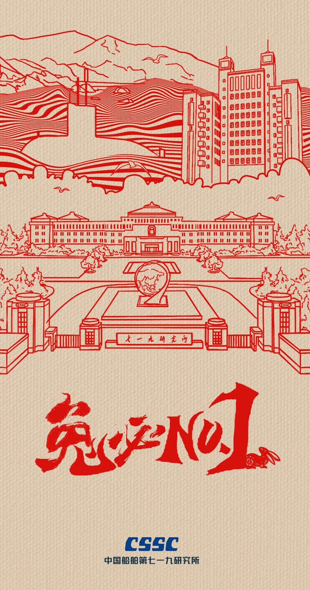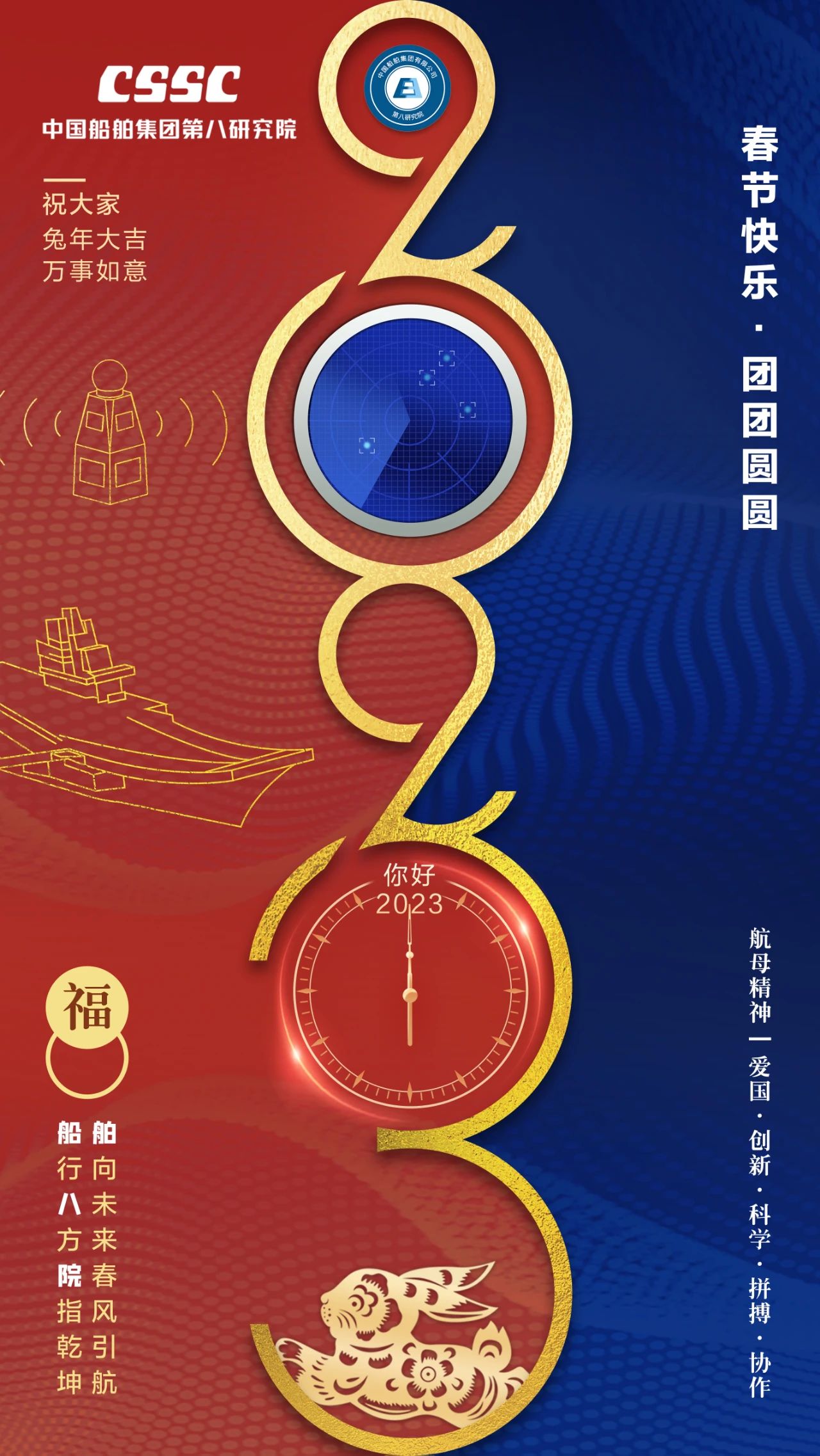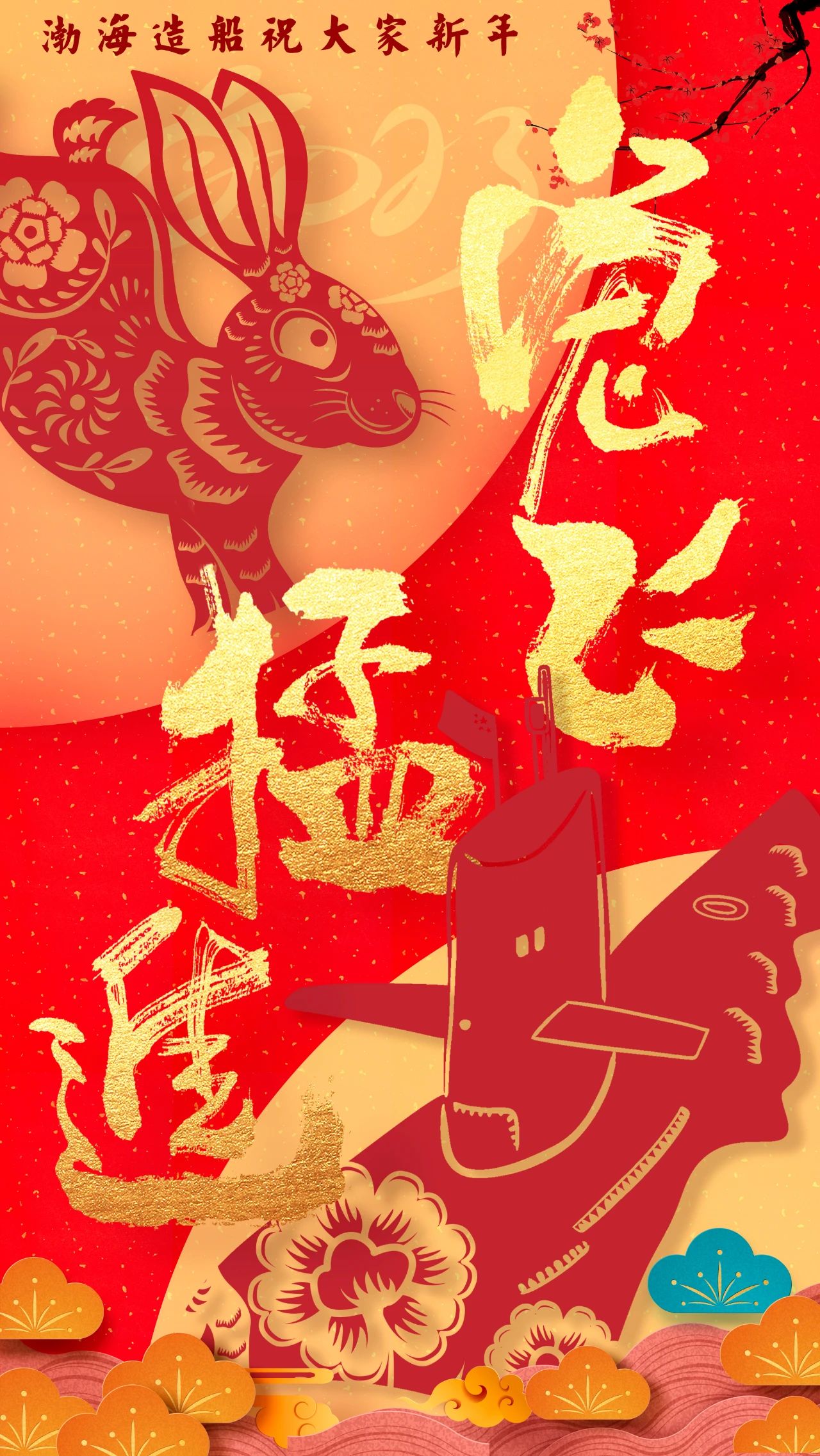 渤海造船的拜年海報以紅色背景為基礎,奠定喜慶祥和的節日氛圍,畫面主體采用中國傳統民間剪紙藝術,將飛騰的瑞兔與破浪的國之重器有機結合,讓我們2023年突飛猛進,大展宏圖!