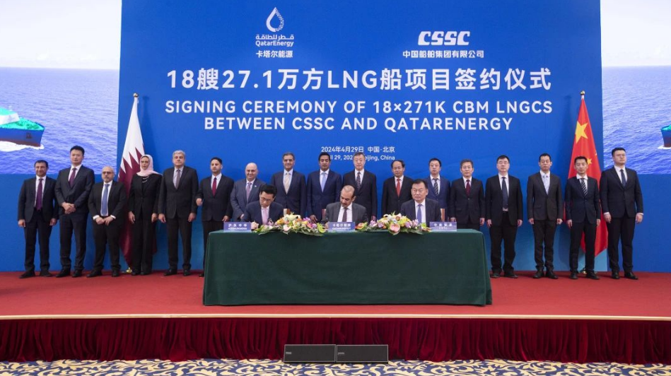 4月29日,中國船舶集團有限公司與卡塔爾能源在京舉行18艘全球最大27.1萬立方米超大型液化天然氣(LNG)運輸船項目簽約儀式。工業和信息化部副部長單忠德,外交部西亞北非司大使呂健,中國船舶集團董事長溫剛、副總經理盛紀綱,卡塔爾能源事務國務大臣、卡塔爾能源總裁兼首席執行官薩阿德·謝里達·阿爾卡比,卡塔爾能源天然氣首席執行官卡利德·阿爾-塞尼,卡塔爾能源商務和業務發展執行副總裁賈西姆·阿爾馬拉祖齊等領導和嘉賓出席簽約儀式。